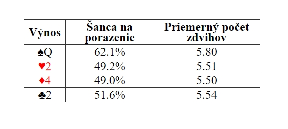 Úvodná úvaha: Nie je dôvod očakávať, že výnos v srdciach alebo v trefoch prinesie úspech. Voľba sa črtá medzi ♠Q a výnosom ♦ z dubla. Pozrime sa na čísla: