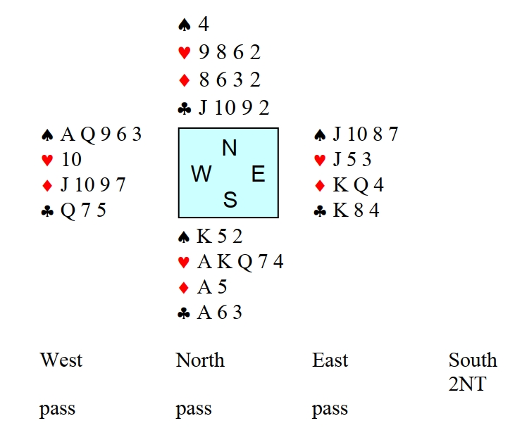Vidíme, že takýto záväzok 2NT sa viac podobá obrane proti záväzku 1NT, keďže body sú opäť rovnomerne rozdelené. Vidíme, že takýto záväzok je v zrejmom ohrození a akýkoľvek výnos, dokonca aj trefový, vám poskytne šancu na jeho porazenie. Najlepším výnosom je však ♦J, ktorý vám prinesie výhodu pri párovom turnaji.